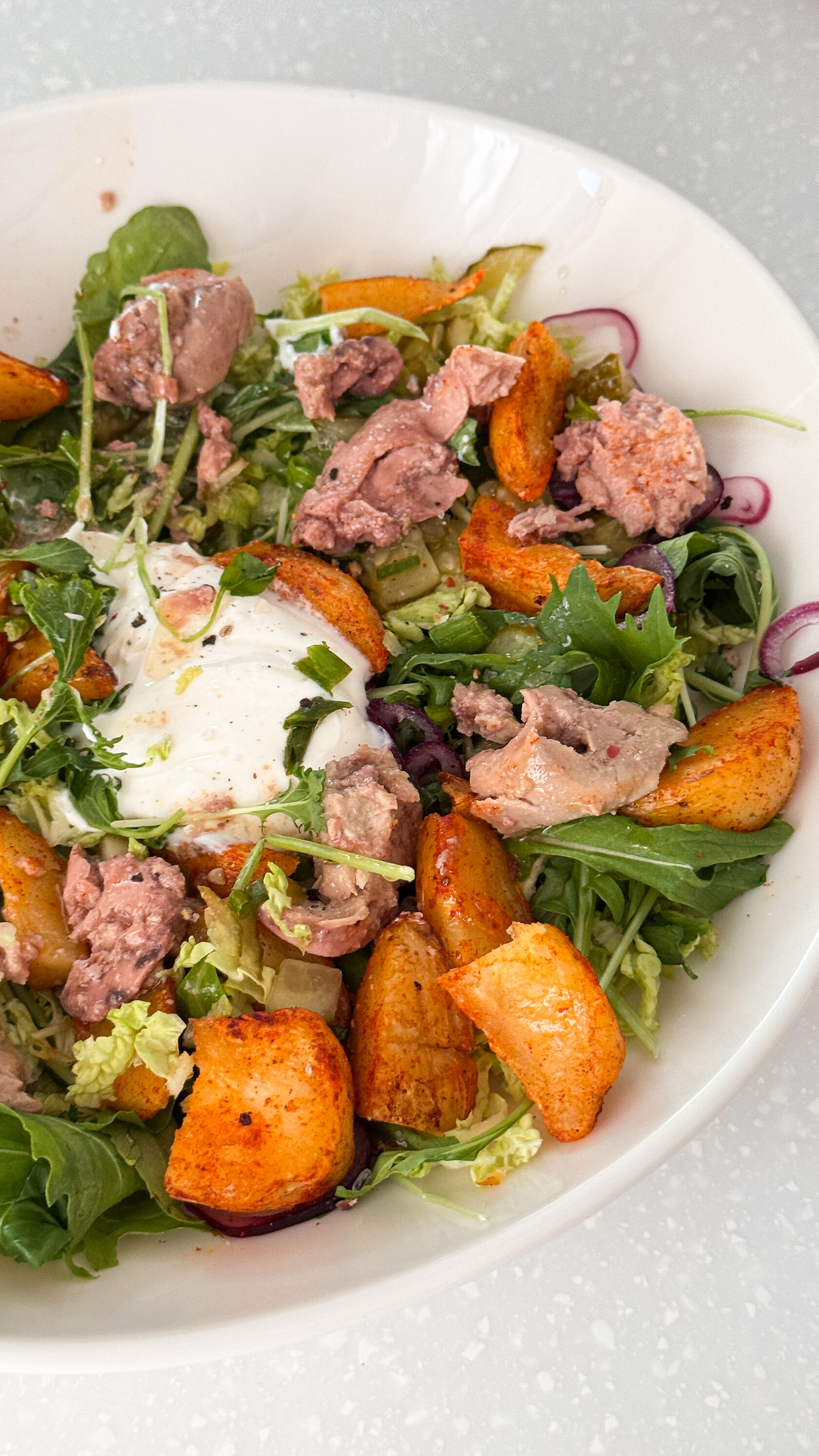 - Выкладываем на тарелку зелень, лук, огурчики, картофель и печень трески. Заправляем салат сметаной.