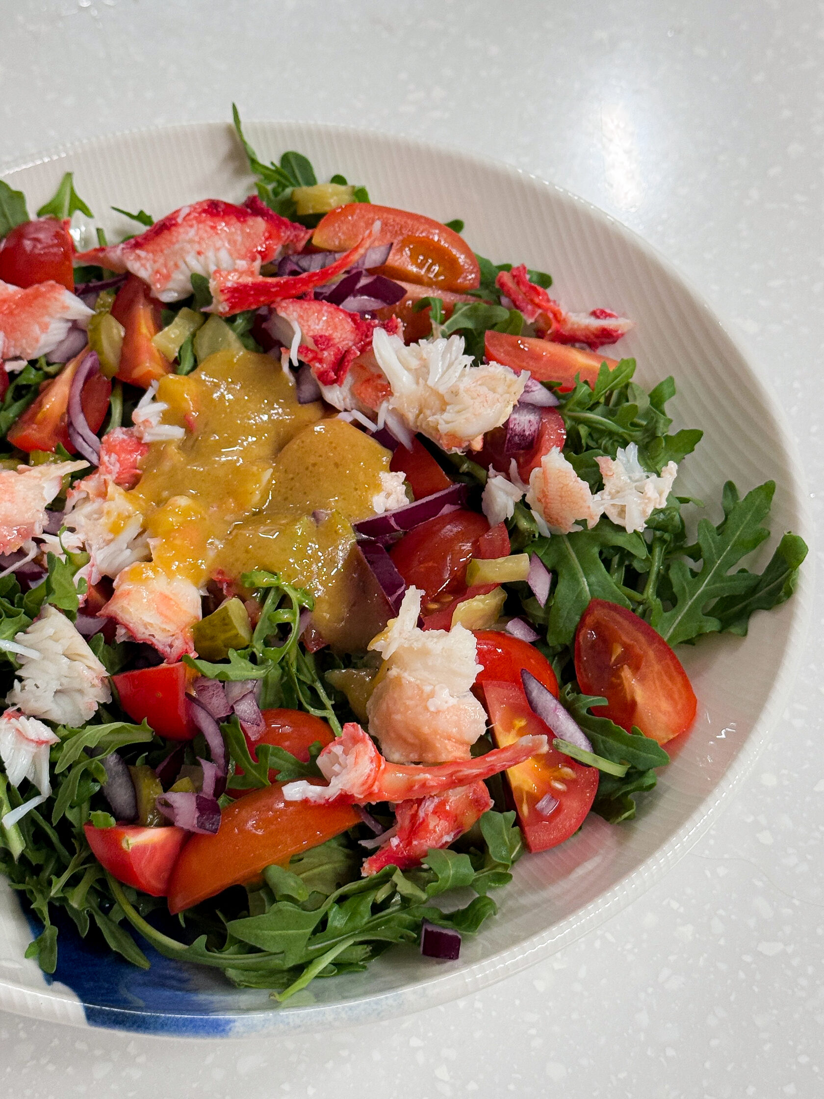 - РСборка. На широкое блюдо или тарелку выложите подушку из рукколы. Сверху разложите крабовое мясо и все нарезанные овощи. Полейте приготовленной заправкой прямо перед подачей.